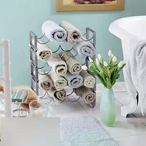 解決方案:酒架除了收藏紅酒,還是衛浴間里不錯的儲物工具。把毛巾卷起來隔在上面,既是個性的裝飾物,又是不錯的收納架。
